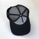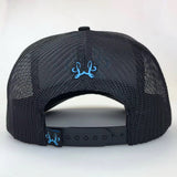 OUR BLACK TRUCKER CAP WITH EMBROIDERED 2LS LOGO IN BABY BLUE.